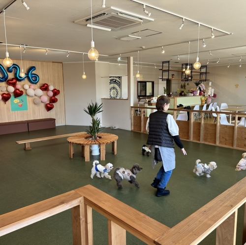 DOG CAFE Bellは、広々としたレイアウトで大型宴会にも対応可能◎貸切利用も承っており、広いスペースを完全貸切すれば、愛犬と一緒でも周囲を気にすることなく楽しめます。木目調の温かな雰囲気に包まれながら楽しむパーティーは一体感があり、リラックスできる空間を演出♪愛犬がのびのび遊べる広場も完備!